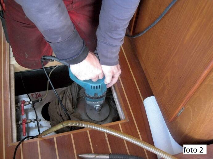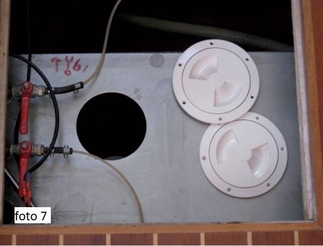 (foto 5, foto 6). De gebruikte apparatuur werd steeds gereinigd met doek of papier en in de tussentijd opgeslagen in plastic zakken, zodat de boot niet vuil werd. In de inspectieopeningen werden deksels geplakt, di later weer gemakkelijk kunnen worden geopend. De gefilterde brandstof werd weer in de tank gedaan en de inspectiegaten werden gesloten (foto 7). Het schoonmaken van de tank duurde ongeveer twee uur en kostte ongeveer € 360,00 exclusief reiskosten. Zoals reeds vermeld zijn de reiskosten afhankelijk van het aantal opdrachtgevers in een haven. Het werk werd zeer professioneel en absoluut schoon uitgevoerd. Nergens in de boot of op het dek was een vervuiling door brandstof te bespeuren. Wij waren erg tevreden over het werk van het bedrijf MFT. Ik heb geen persoonlijke relaties met dit bedrijf, maar ik had veel positieve meningen van andere klanten gelezen Vanaf onze tank lopen nog twee andere leidingen: voor de brandstof naar de verwarming en naar de Wallas-kookplaat, die beide ook op diesel gaan.